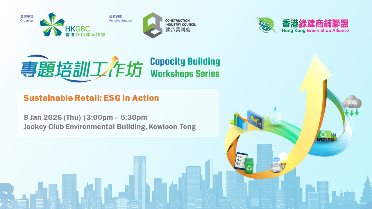 Organised by the Hong Kong Green Building Council and funded by the Construction Industry Council, the Hong Kong Green Shop Alliance (HKGSA) is pleased to present three “Capacity Building Workshops” tailored for mall and shop operators. Featuring experienced sustainability experts, the workshops will offer interactive exchanges and in‑depth insights into the latest environmental trends in retail.